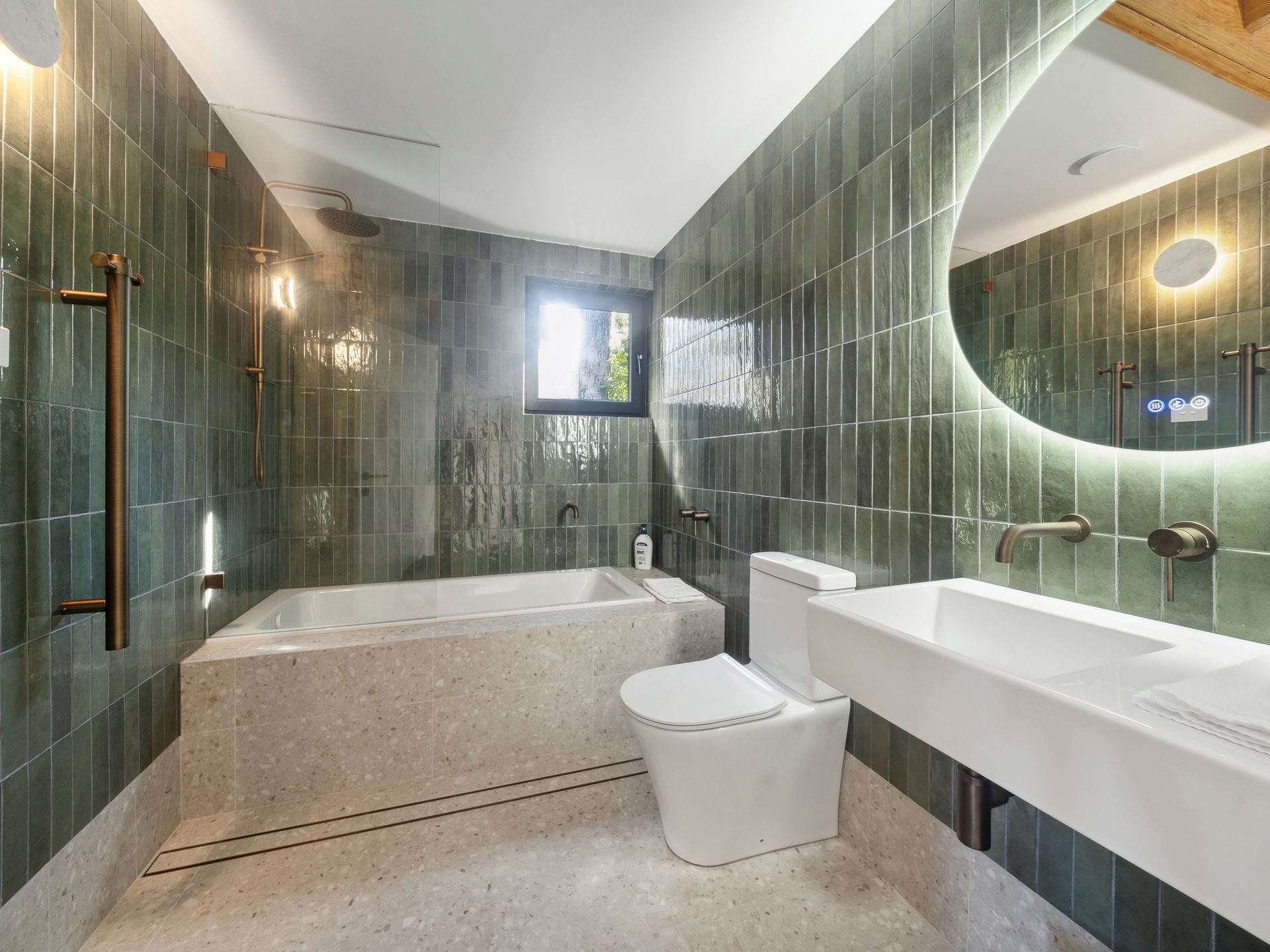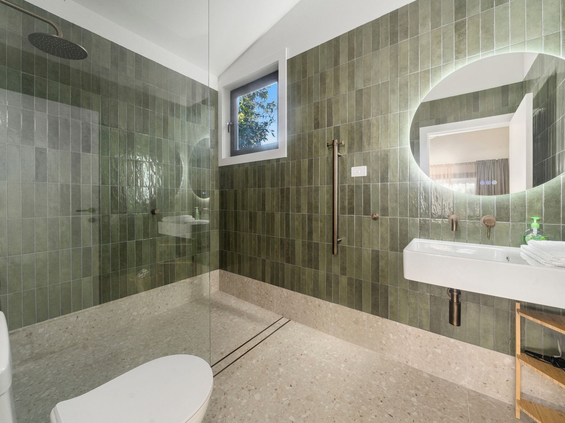 Bedroom 1: 1 × Queen bed, ensuite with shower, vanity, and toilet