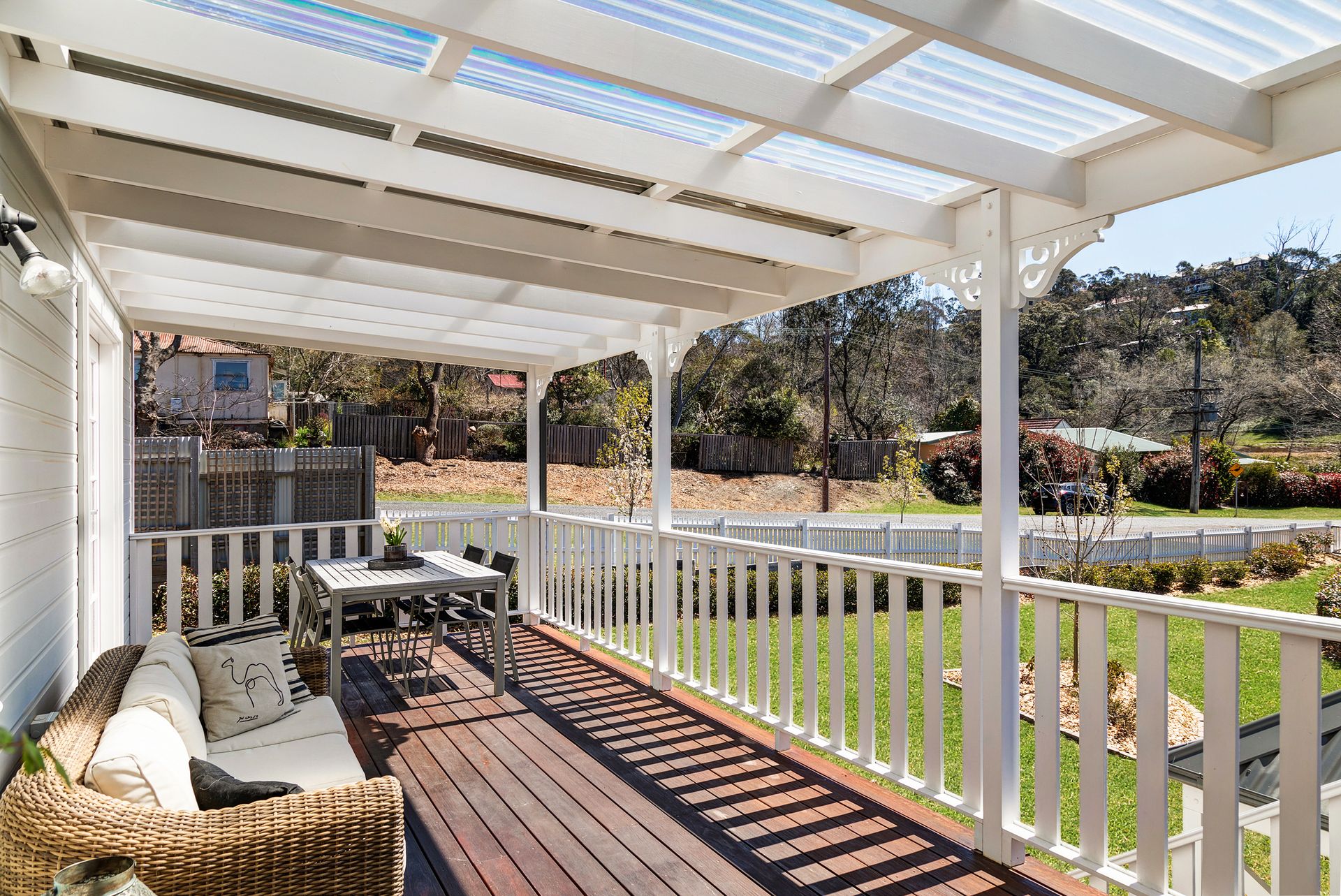 Outside, multiple outdoor seating areas and a covered balcony invite you to relax and enjoy the fresh mountain air. The fully equipped kitchen features modern appliances including a Nespresso pod machine, cooktop, oven, dishwasher, and basic pantry items. For entertainment, the lounge/dining room offers a 55-inch Smart TV with Foxtel and streaming apps such as Netflix and Prime.