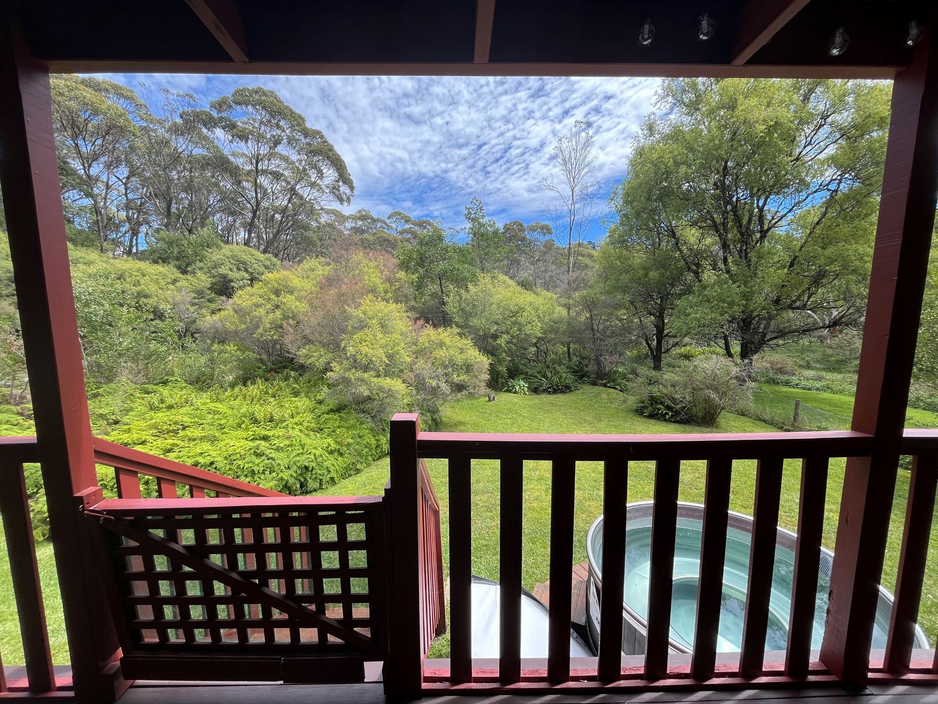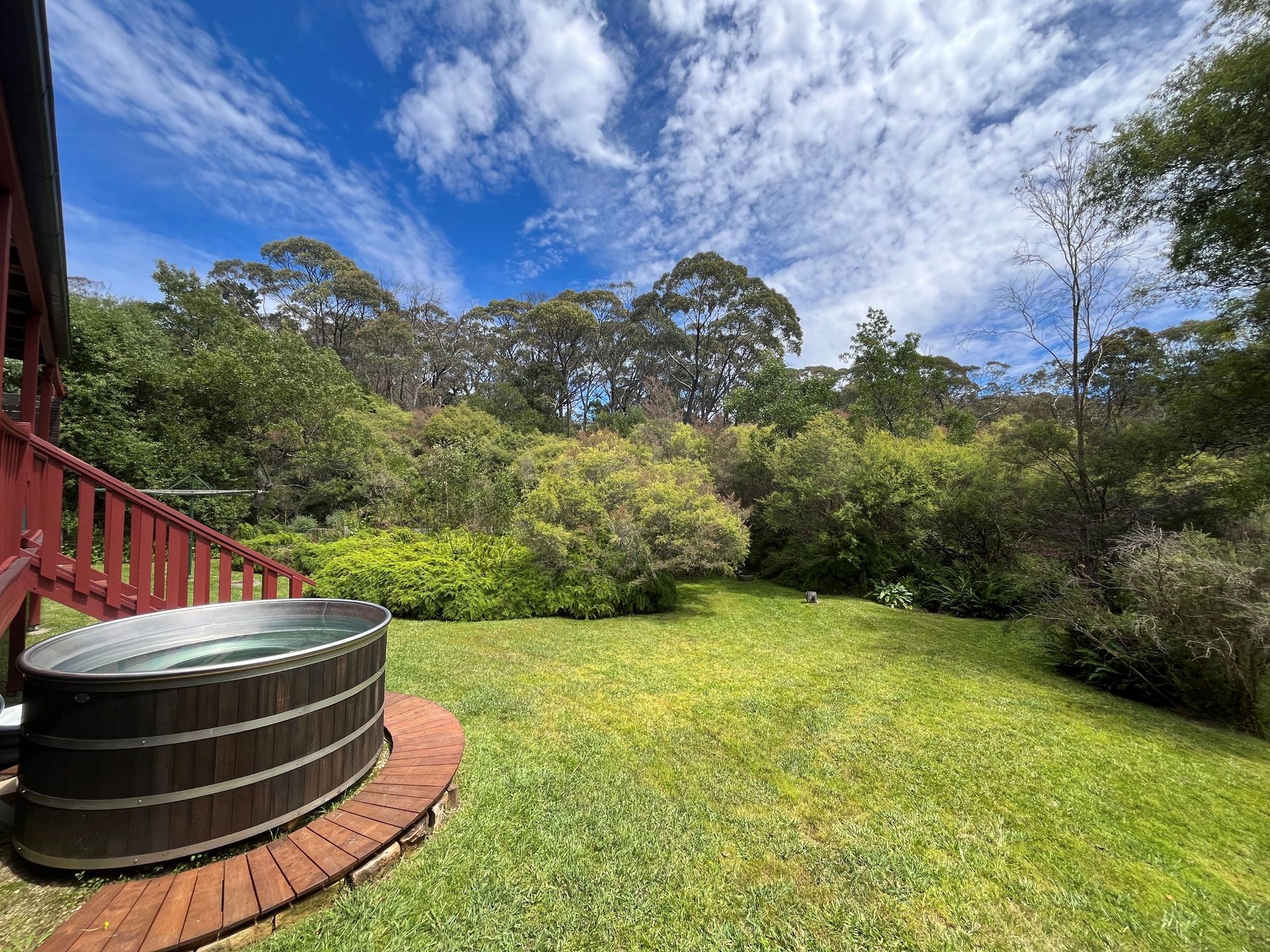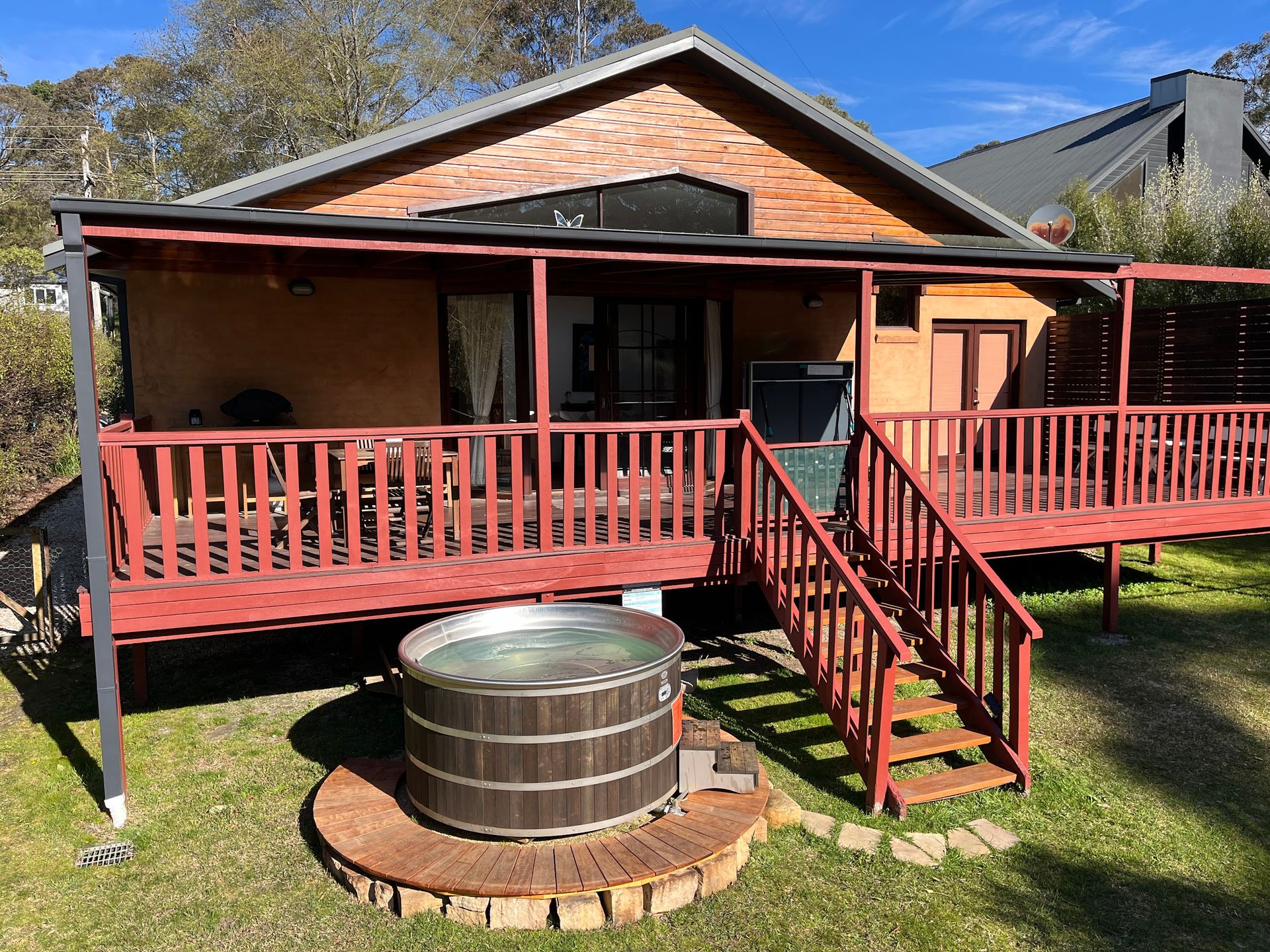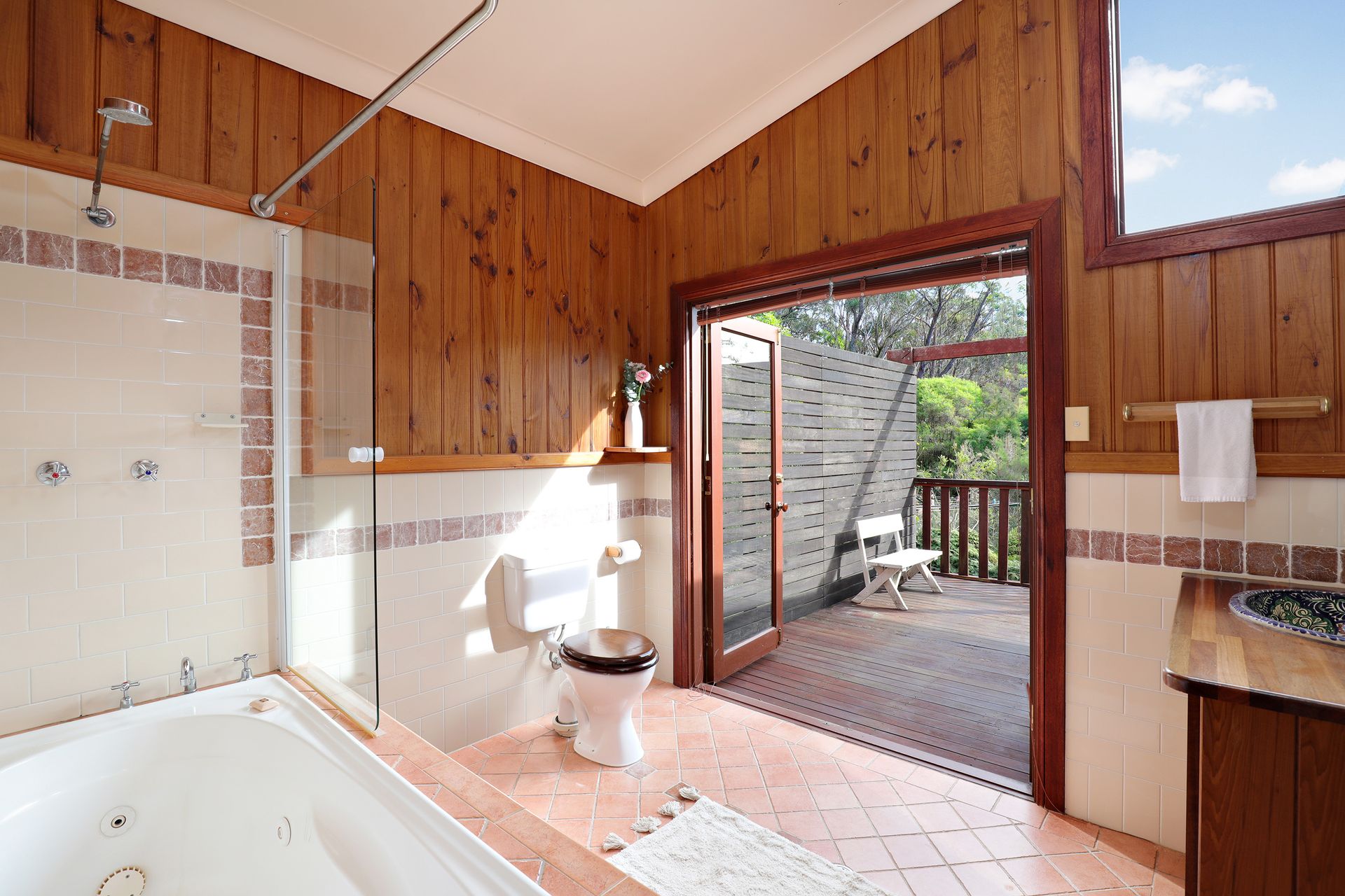 The main bathroom boasts a spa bath with views over the deck and into the bush, a shower over the bath, and a toilet overlooking the deck and garden.