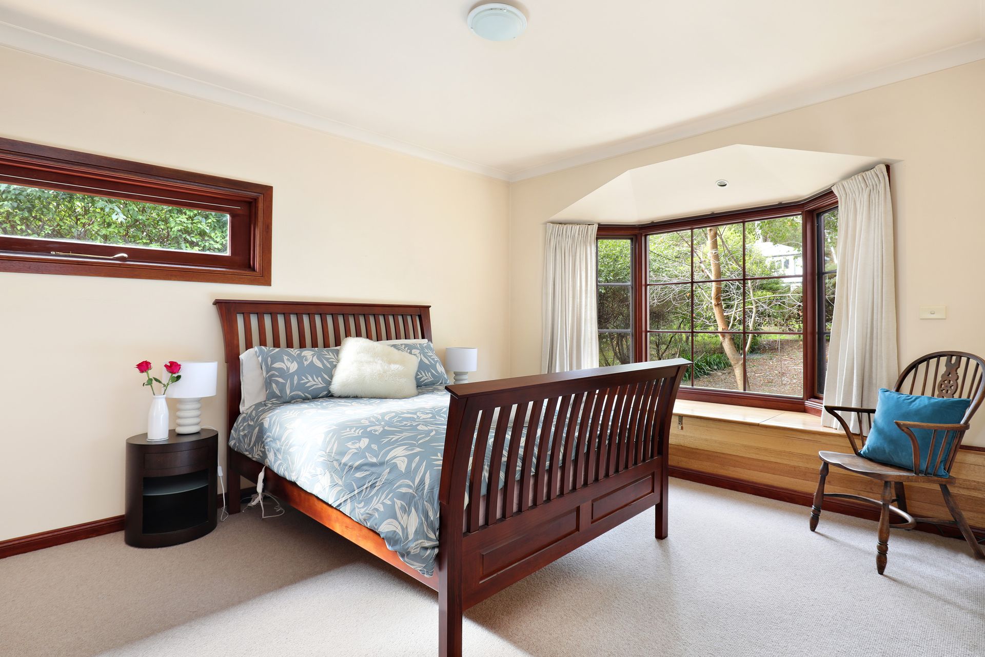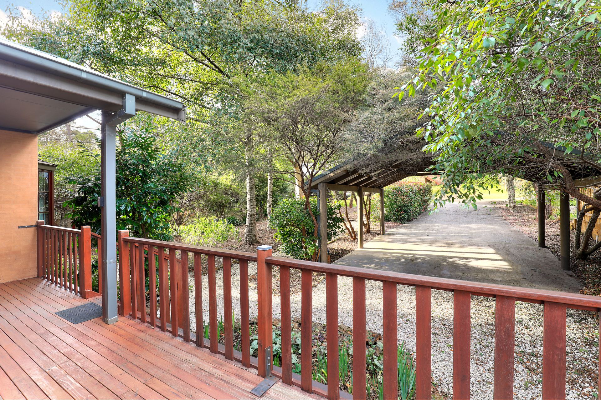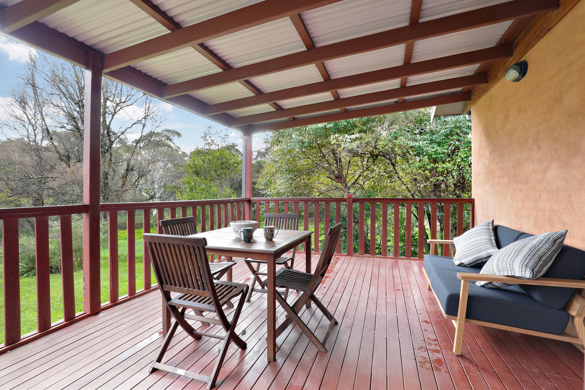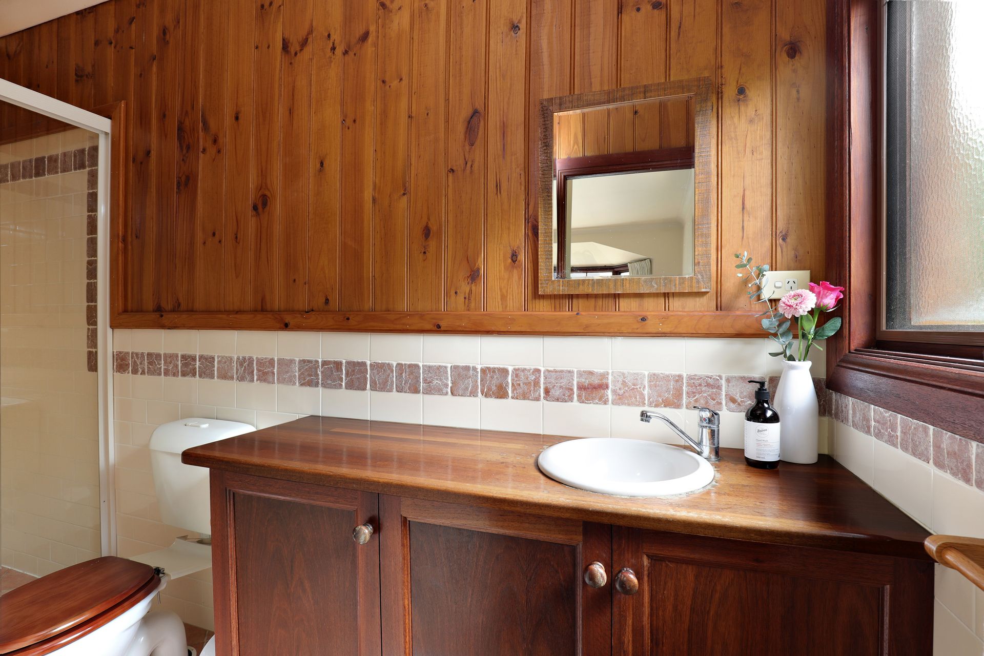 The main bathroom boasts a spa bath with views over the deck and into the bush, a shower over the bath, and a toilet overlooking the deck and garden.