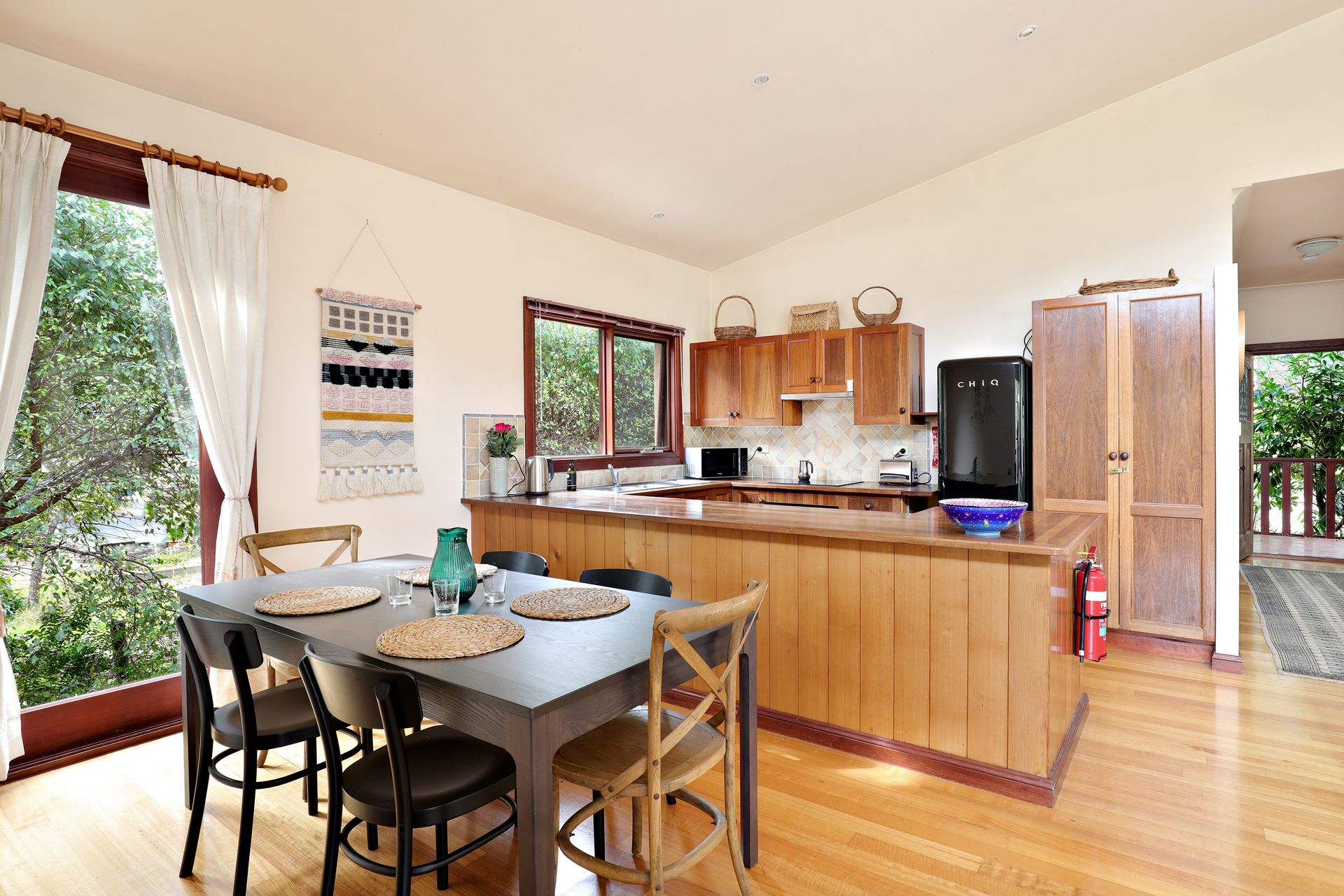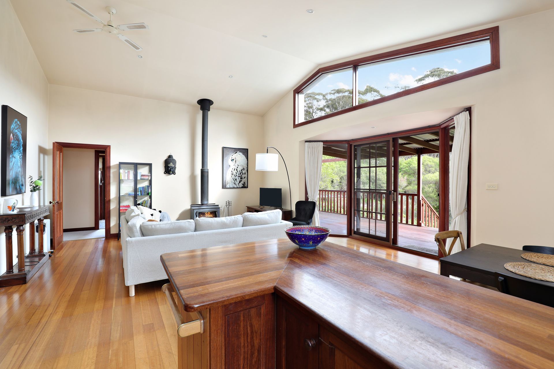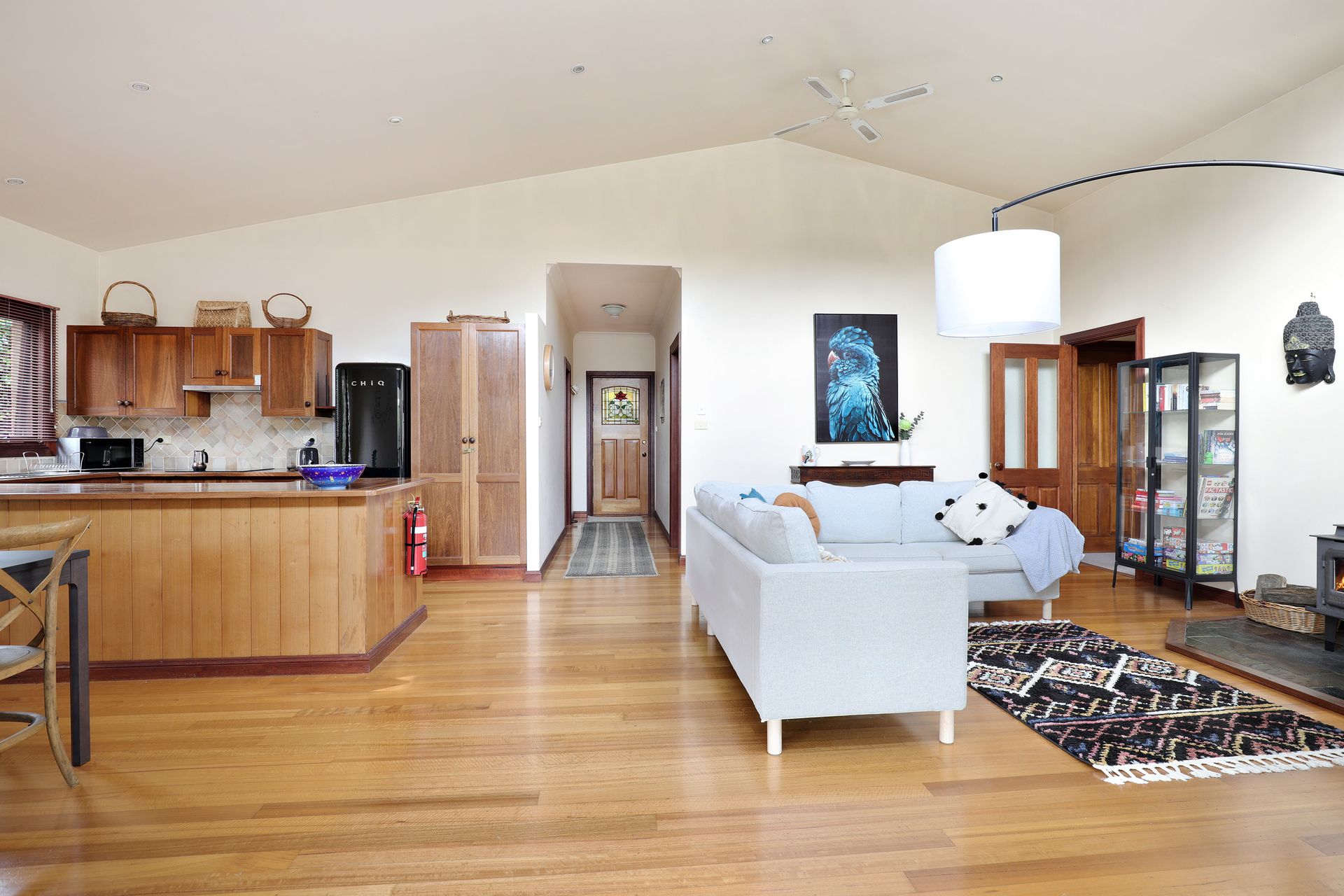 Enjoy free WiFi connectivity, although please note that phone reception may have weak signal strength with some providers. The open-plan kitchen, dining, and living space at Dingley Dell features high ceilings and a slow combustion fireplace, offering both warmth and a view of the bush. The lounge room is designed for relaxation and includes a slow combustion fireplace, a cozy rug, a corner sofa, and an armchair.