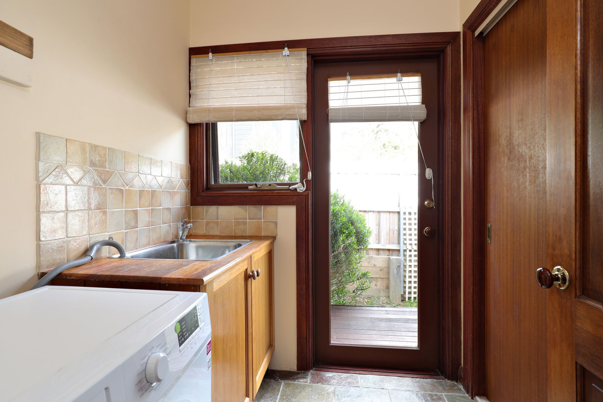 A laundry area provides a washing machine, laundry tub, ironing facilities, and an external clothesline.