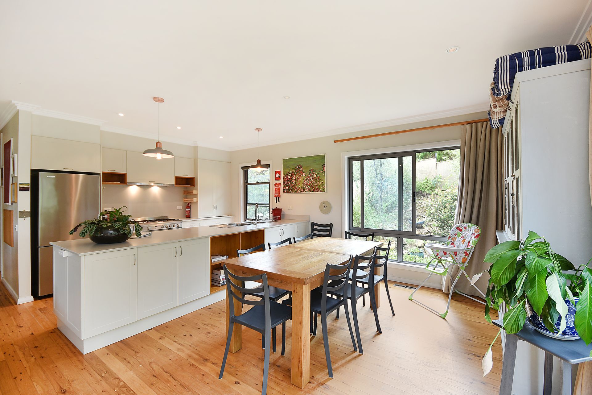 Enjoy polished timber floors, open-plan living, and seamless flow between multiple lounge and dining areas. The fully equipped kitchen boasts a large gas range, dishwasher, and all modern conveniences, while the adjoining dining space opens onto a leafy rear deck with tranquil bush views — perfect for relaxing with your morning coffee or evening drink.