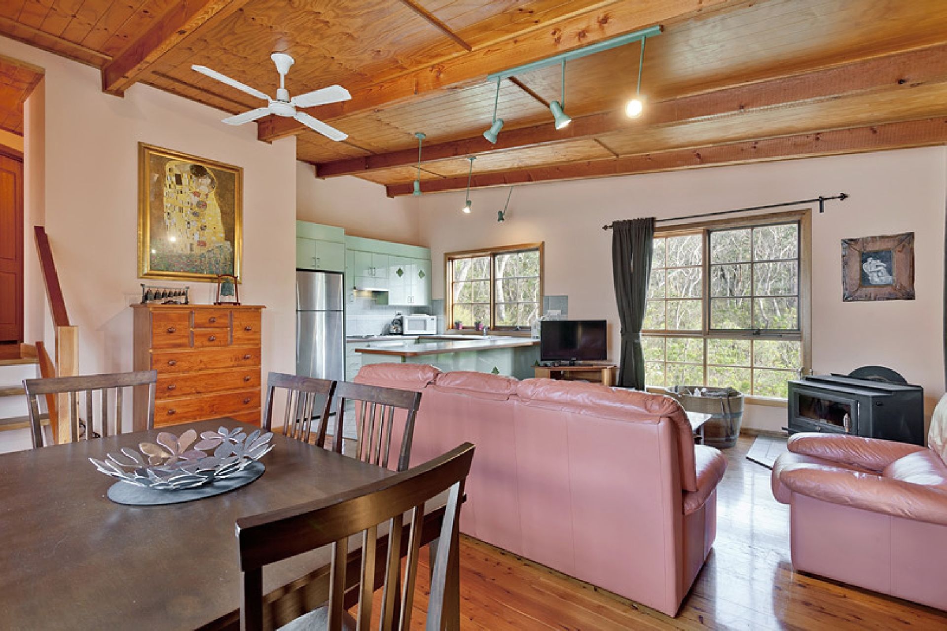 The combined kitchen, dining, and lounge area is fully equipped with modern conveniences including an oven, cooktop, dishwasher, and complimentary Wi-Fi. Gather around the 32" TV or enjoy the warmth of the slow combustion wood fireplace, perfect for cooler months.