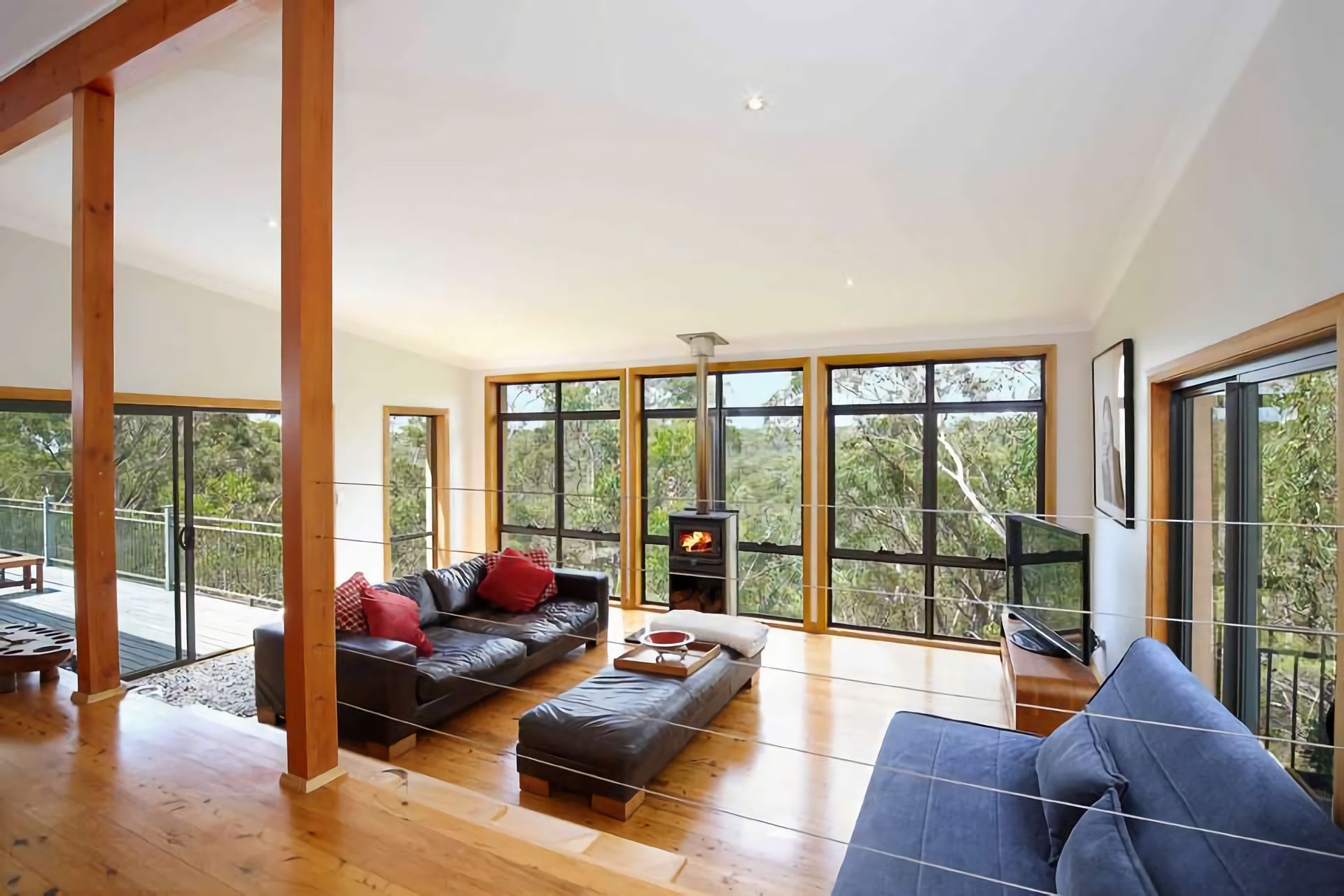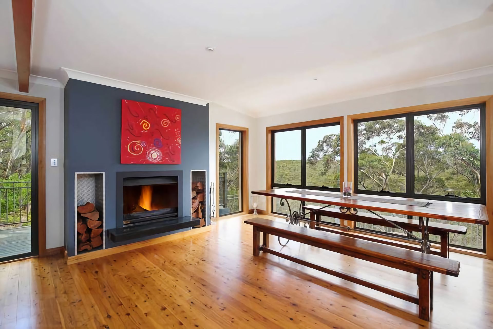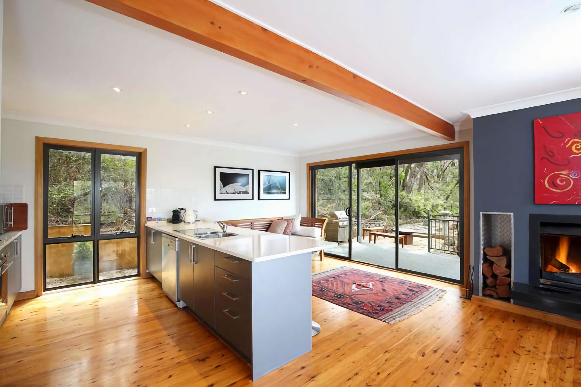 The fully equipped kitchen includes a Nespresso machine and flows into a spacious dining area. Outdoors, discover private bushland with unique sculptures, a BBQ, alfresco dining area, and fire pit (seasonal use only). Reverse-cycle air conditioning and supplied firewood ensure year-round comfort.