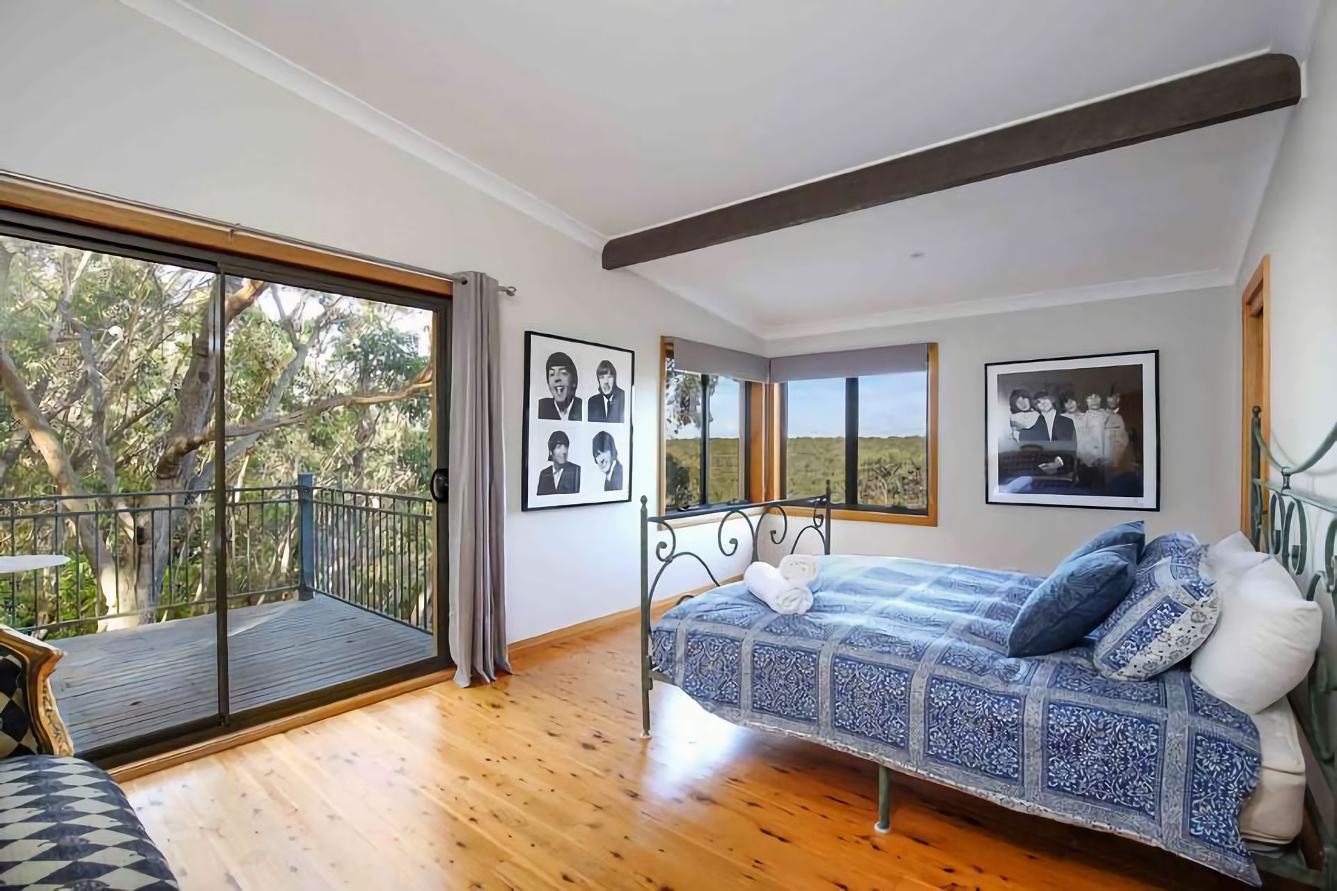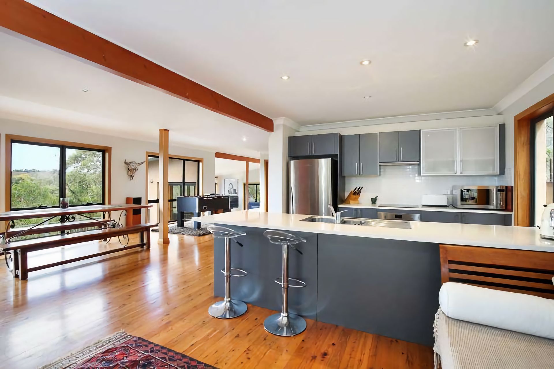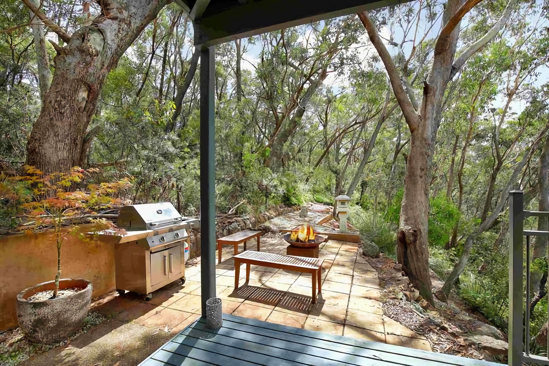 The fully equipped kitchen includes a Nespresso machine and flows into a spacious dining area. Outdoors, discover private bushland with unique sculptures, a BBQ, alfresco dining area, and fire pit (seasonal use only). Reverse-cycle air conditioning and supplied firewood ensure year-round comfort.