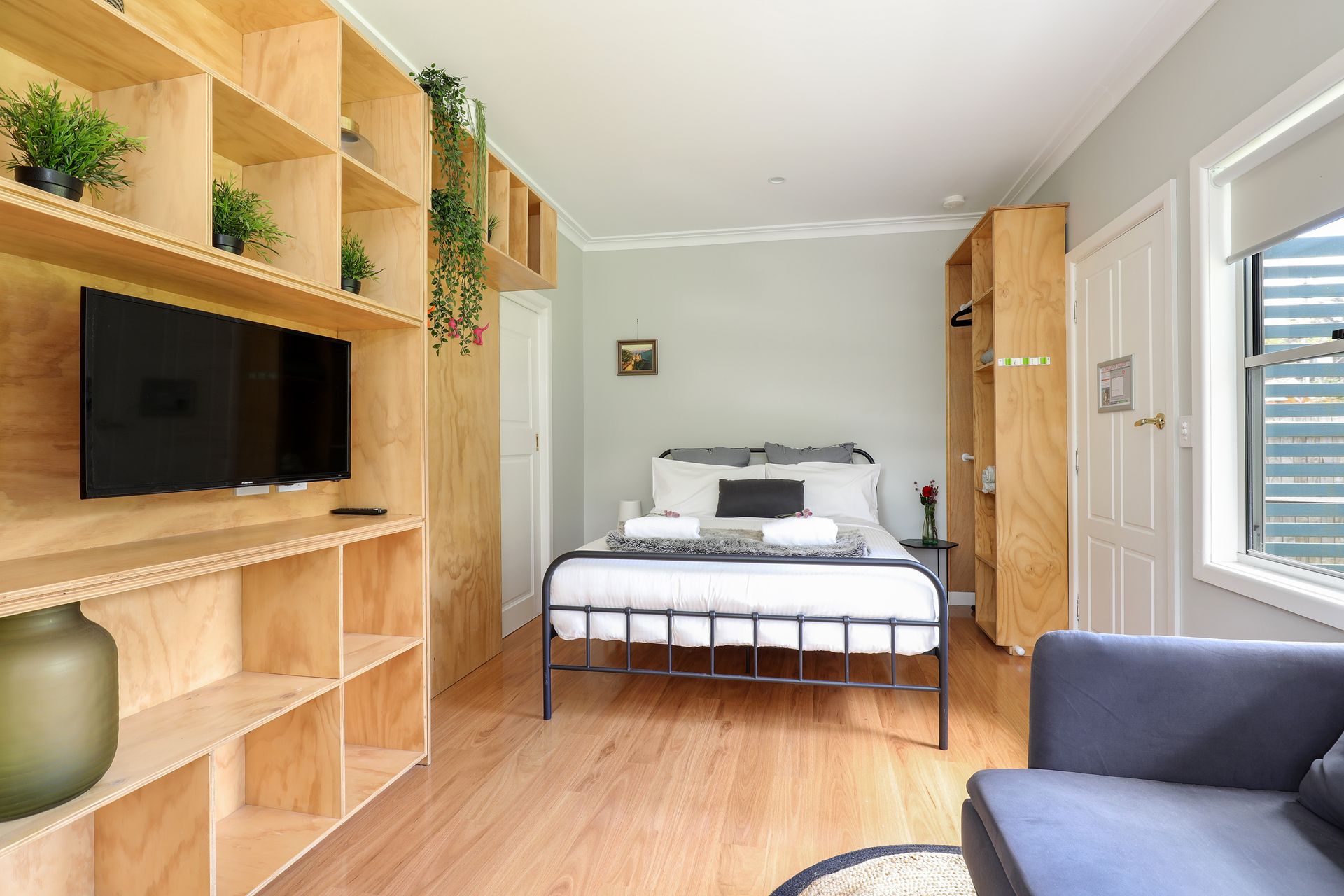 In addition to the main house, a separate self-contained cottage offers privacy and comfort for two guests, complete with a queen bed, bathroom, kitchenette, lounge chairs, and TV.