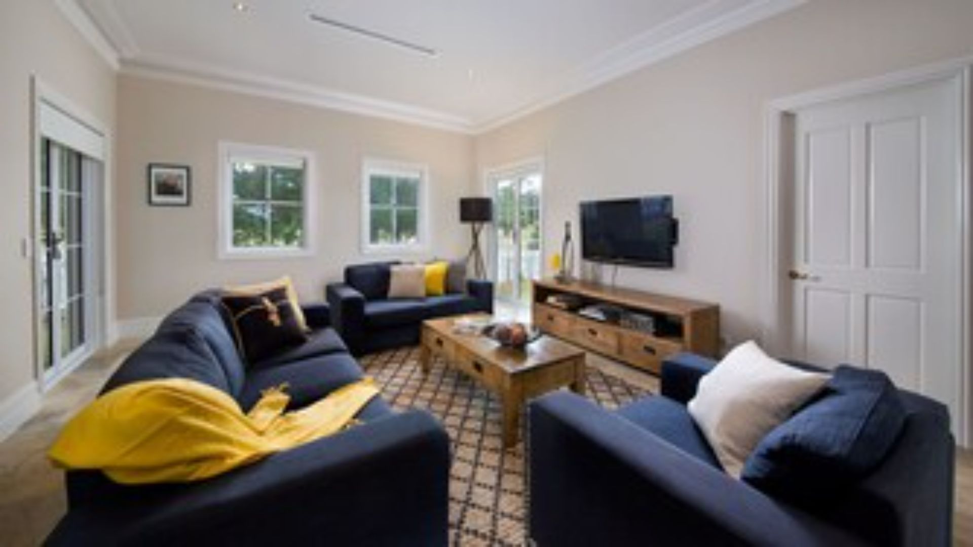 Stableford House is a stunning Blue Mountains escape overlooking the 18th fairway of Wentworth Falls Golf Course. Set on 1,400 sqm of landscaped gardens, this designer home combines elegance, comfort, and spectacular mountain vistas. Perfect for families or groups, the house features four spacious bedrooms, three marble bathrooms, and multiple living areas designed for both relaxation and entertainment.