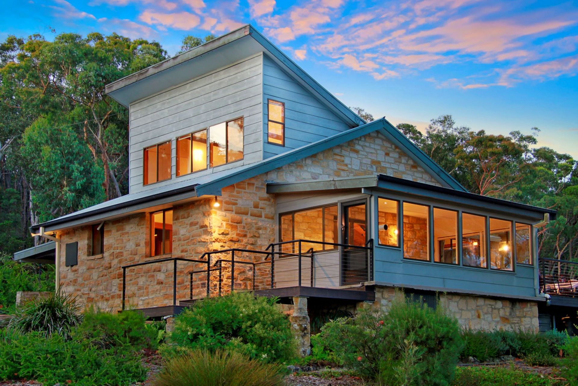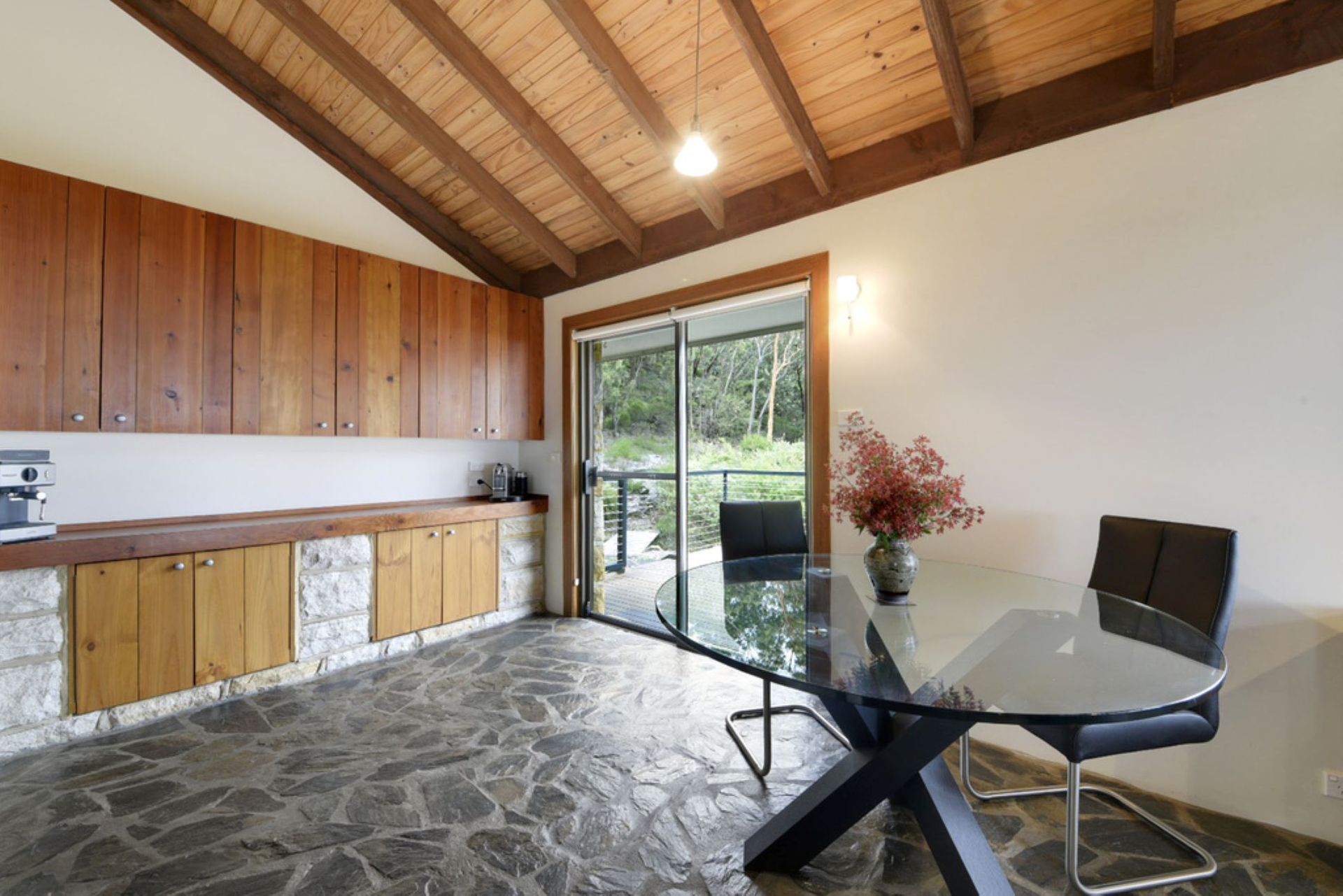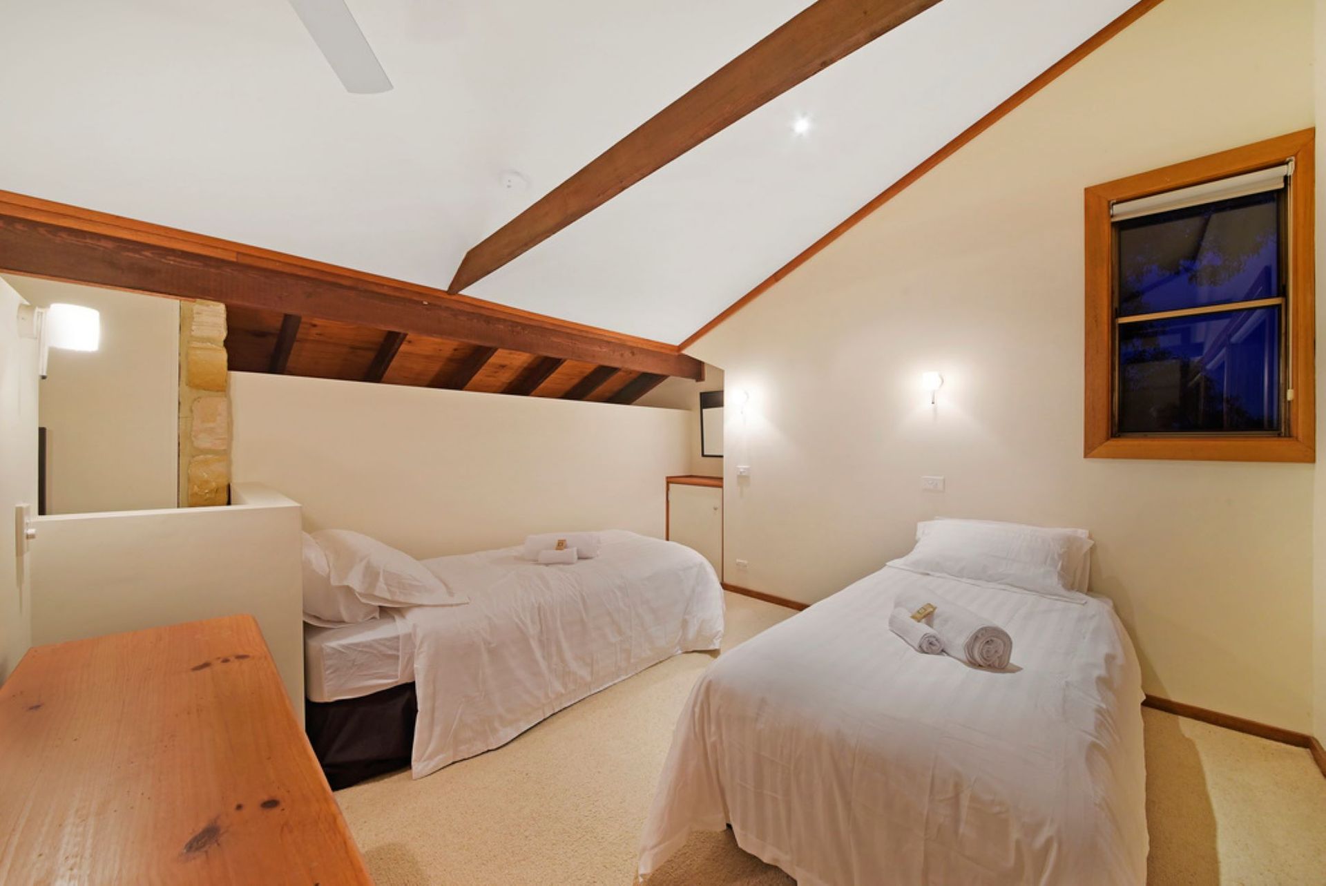 Designed with contemporary solar passive principles, the home combines sandstone, slate, and timber to create warmth and sophistication. The loft-style master bedroom features vaulted ceilings, sandstone walls, an ensuite with bath, and built-in robes. Downstairs, the second king bedroom includes its own ensuite, while the sunroom offers flexible sleeping arrangements with two single day beds. Floor-to-ceiling windows invite the outdoors in, framing the natural bushland setting.