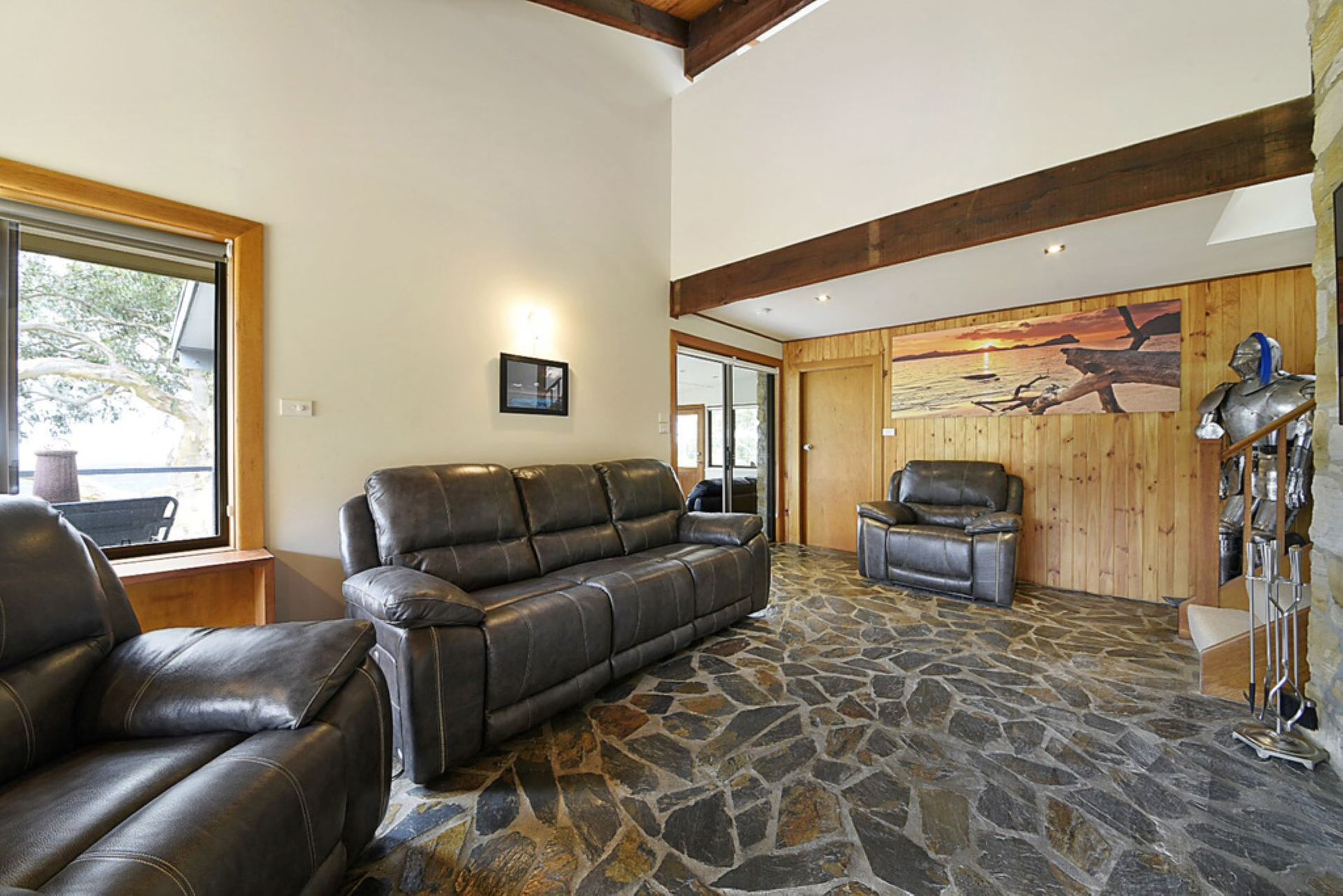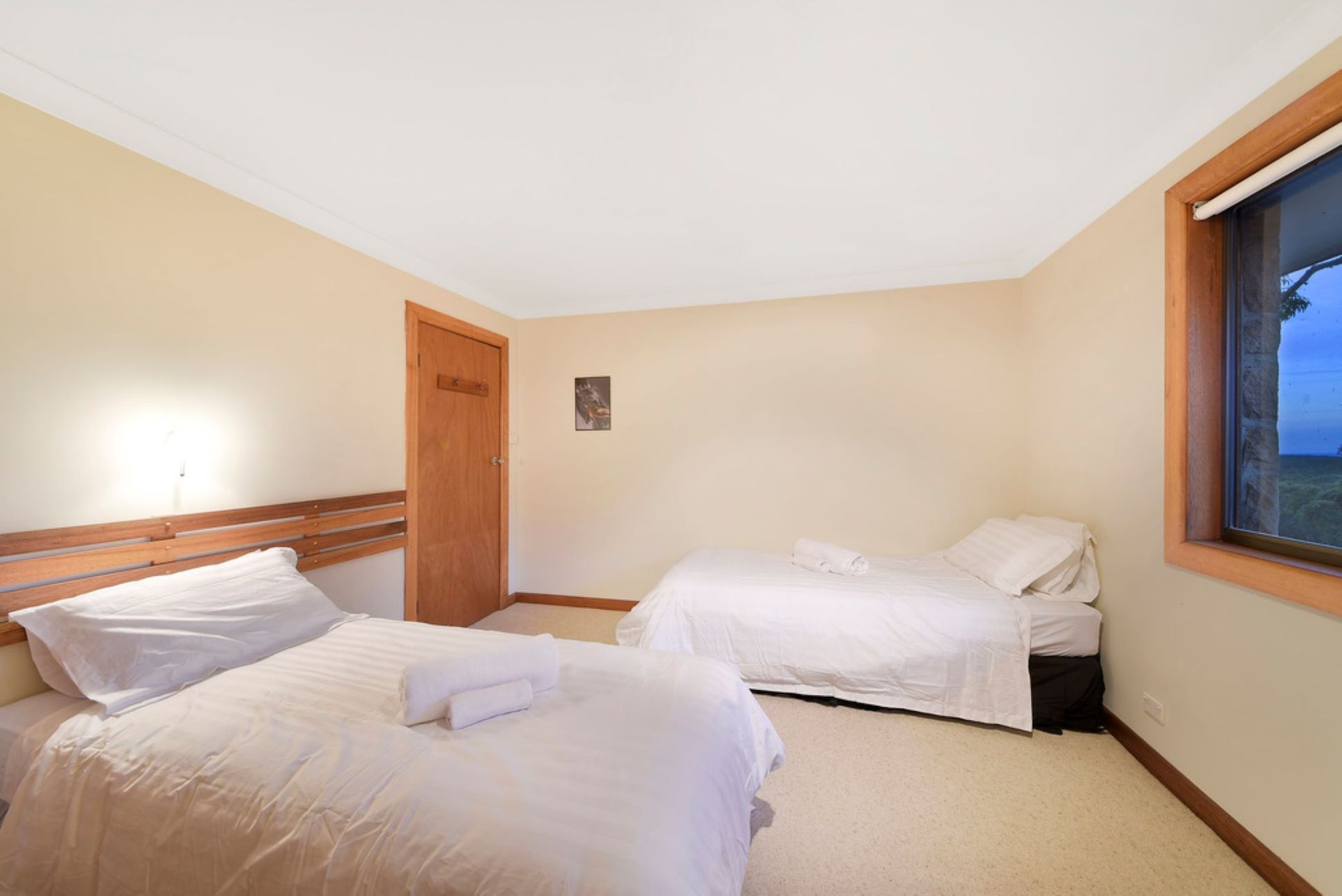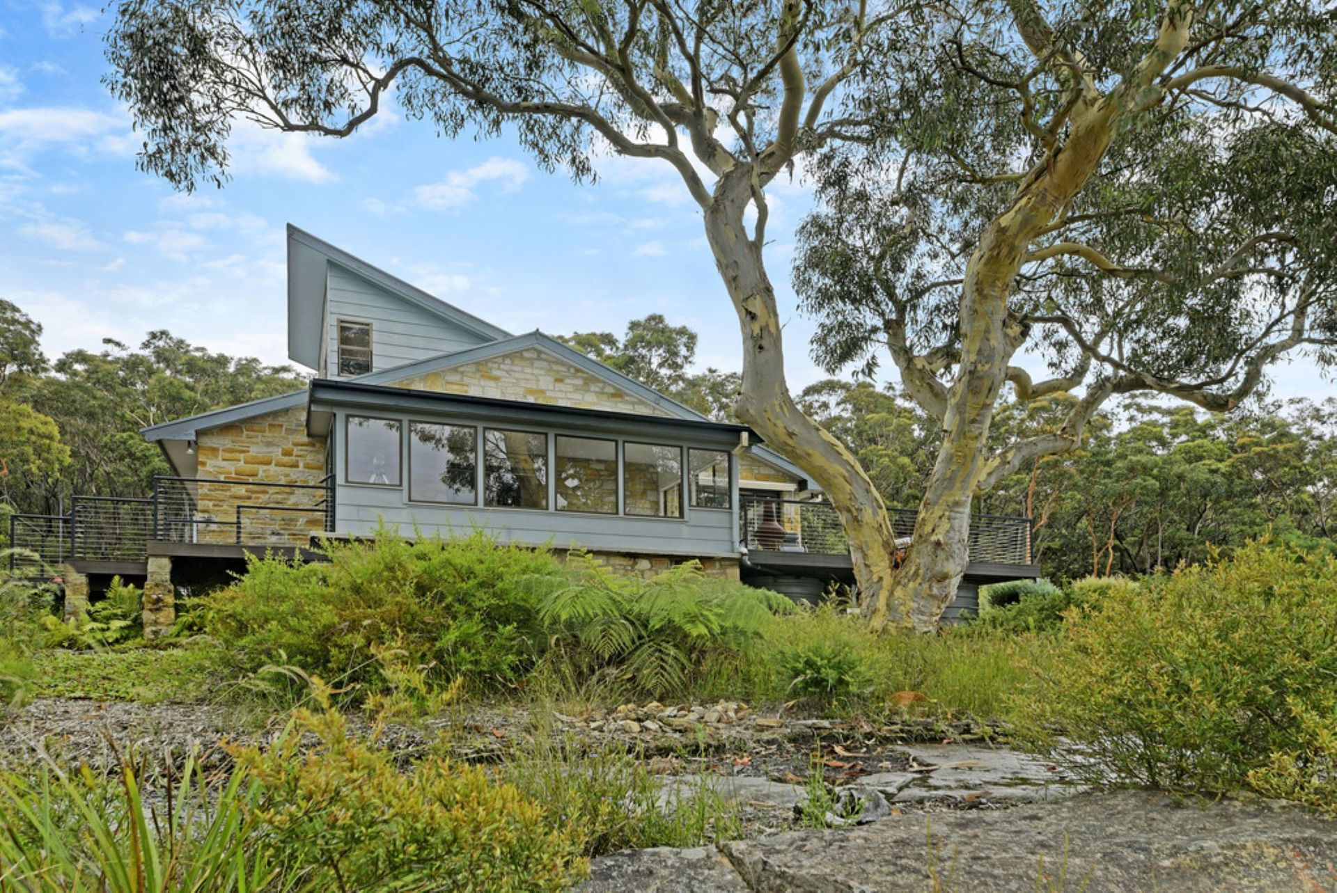 Designed with contemporary solar passive principles, the home combines sandstone, slate, and timber to create warmth and sophistication. The loft-style master bedroom features vaulted ceilings, sandstone walls, an ensuite with bath, and built-in robes. Downstairs, the second king bedroom includes its own ensuite, while the sunroom offers flexible sleeping arrangements with two single day beds. Floor-to-ceiling windows invite the outdoors in, framing the natural bushland setting.