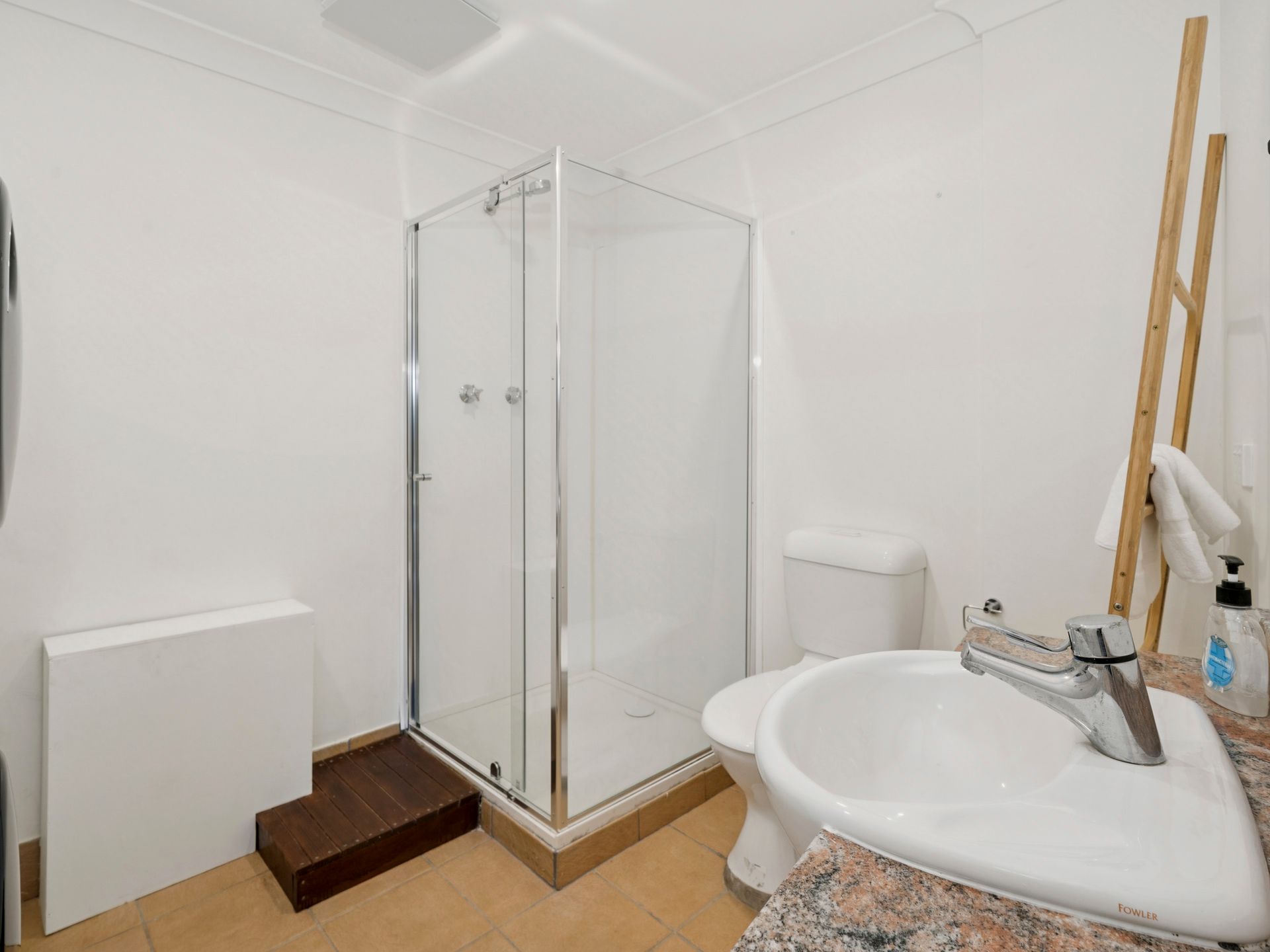 Downstairs Bathroom – Shower, vanity, toilet + laundry